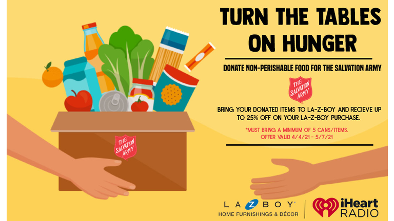 iHeartRadio has partnered with La-Z-Boy to Turn The Tables On Hunger! Help us stock the shelves at the Salvation Army Food Pantries in the Portland Metro area, Salem & Eugene with non-perishable food items. The Salvation Army helps cure hunger daily by providing food boxes and nutritious meals to anyone in need.